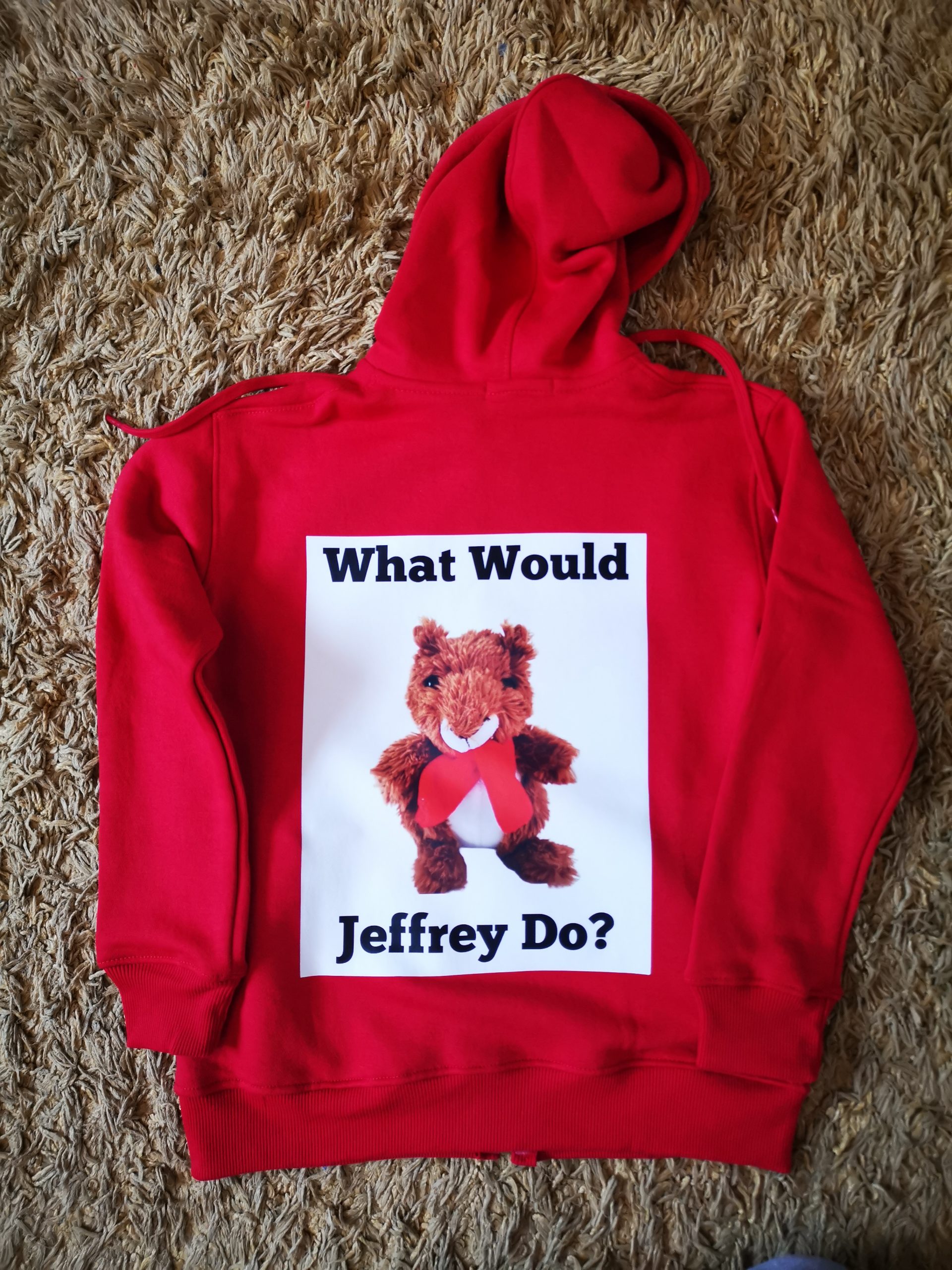Red full zip hoodie with a picture of Jeffrey the squirrel on the front with the words “what would Jeffrey do?”