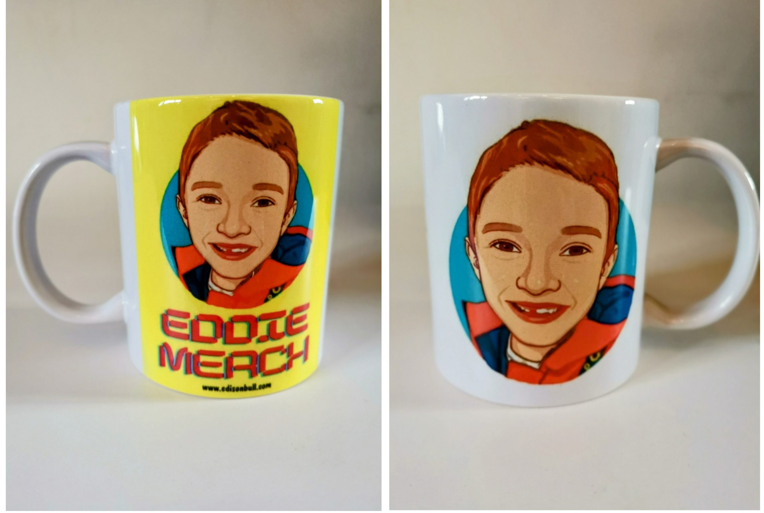 Double sided coffee mug with Edison Bulls avatar on one side and the ‘Eddie Merch’ logo on the other