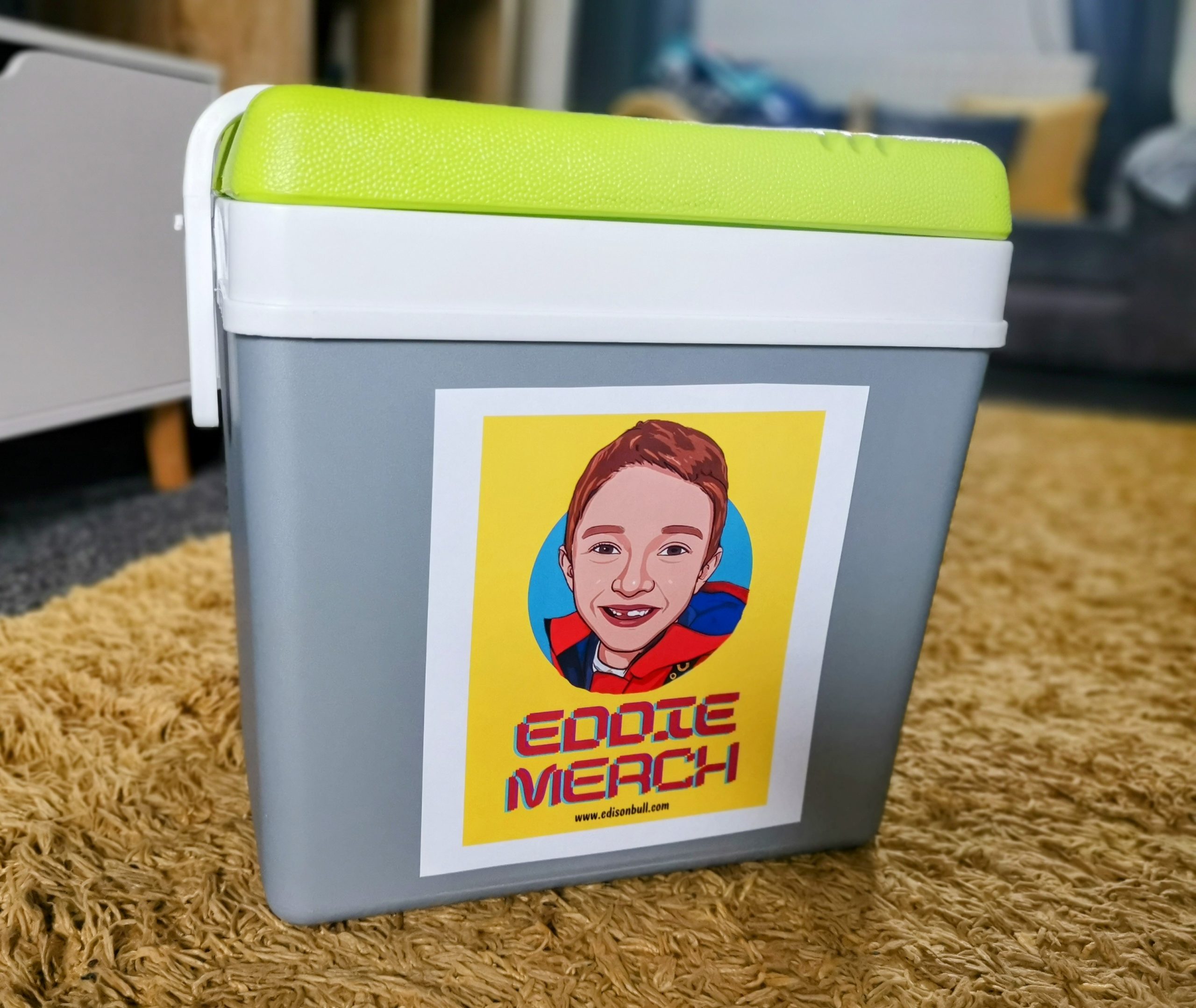 A large cool box with the Eddie Merch logo